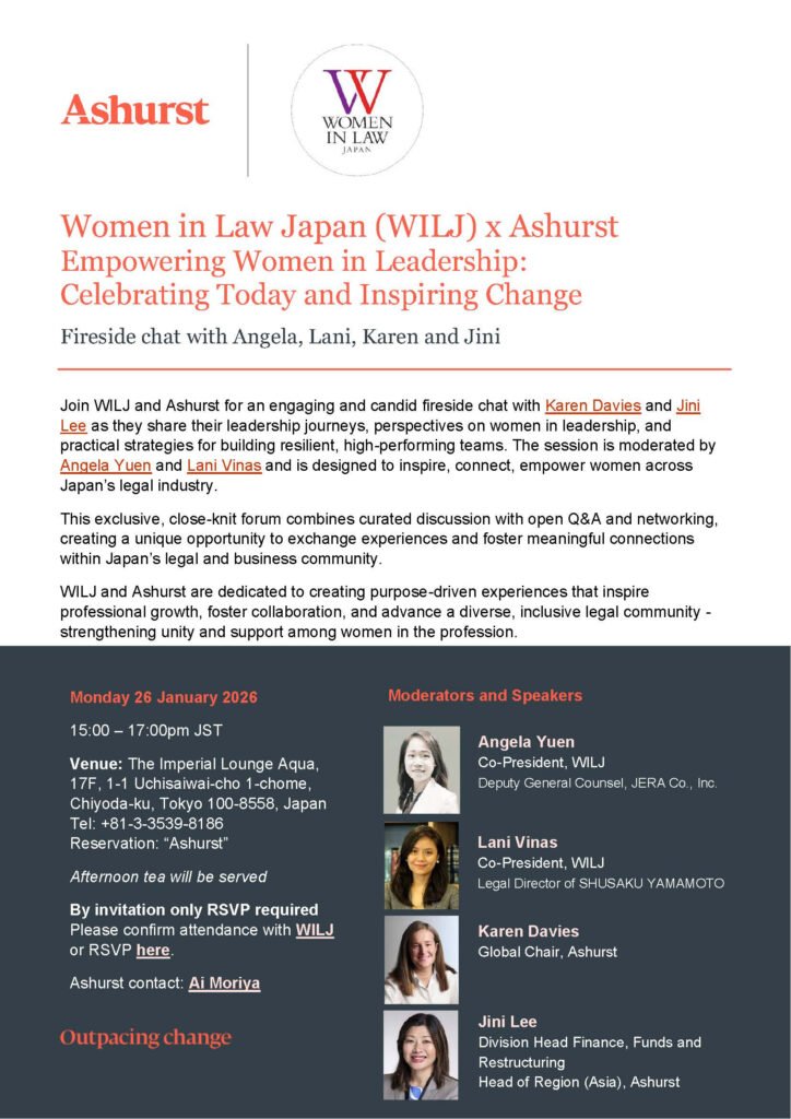 What: Women in Law Japan (WILJ) x Ashurst Empowering Women in Leadership: Celebrating Today and Inspiring Change This close-knit fireside chat will feature Karen Davies and Jini Lee sharing their leadership journeys. When: January 26, 2026 (15:00 – 17:00pm JST) Venue: The Imperial Lounge Aqua,,17F, 1-1 Uchisaiwai-cho 1-chome, Chiyoda-ku, Tokyo 100-8558, Japan