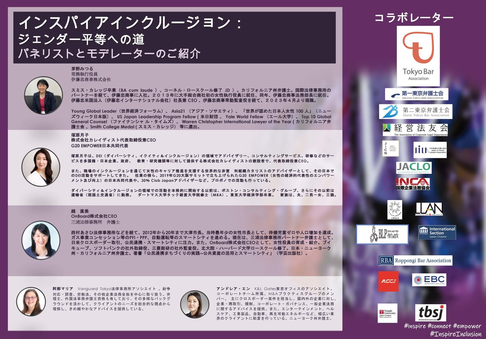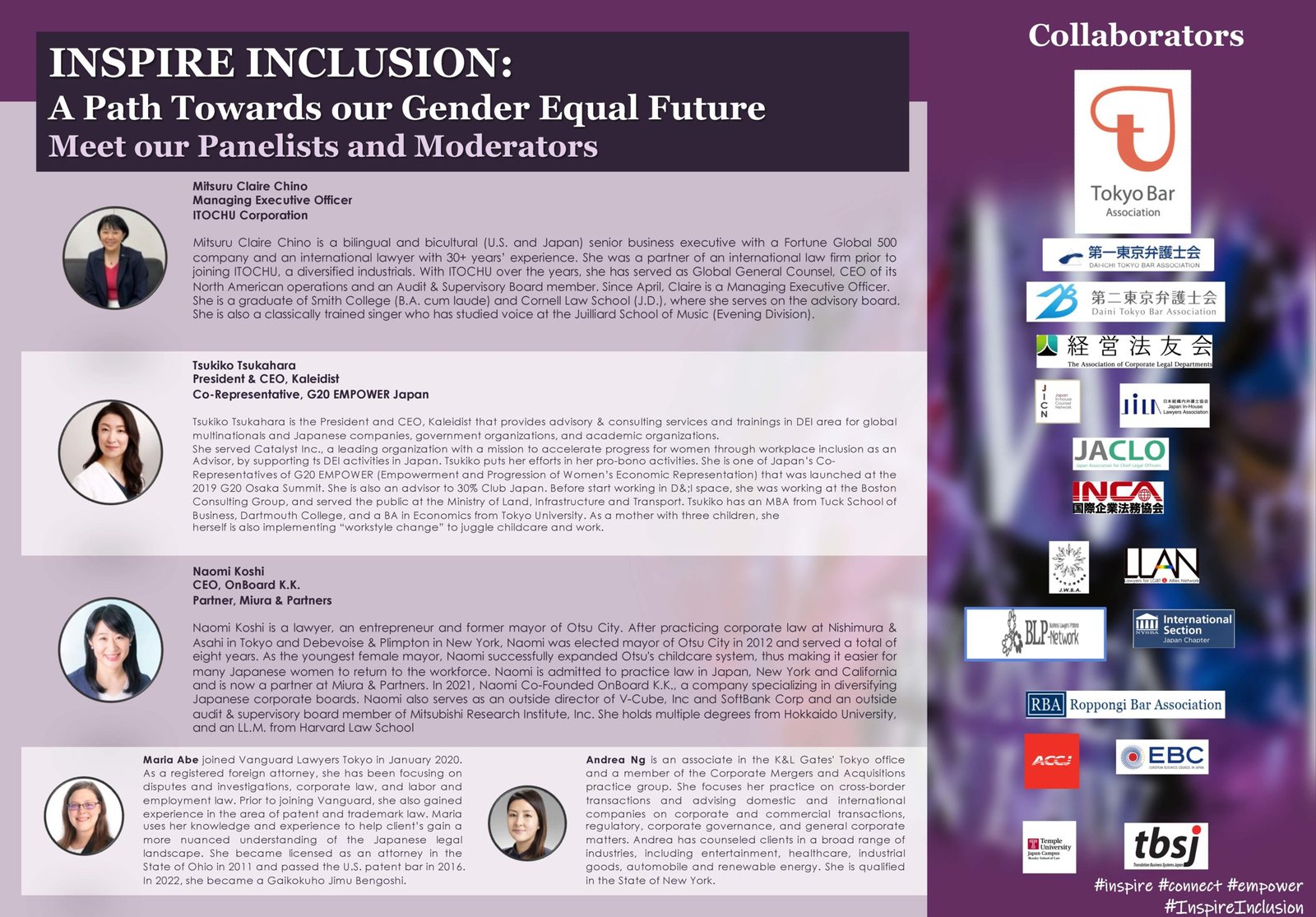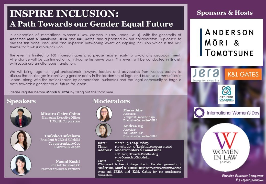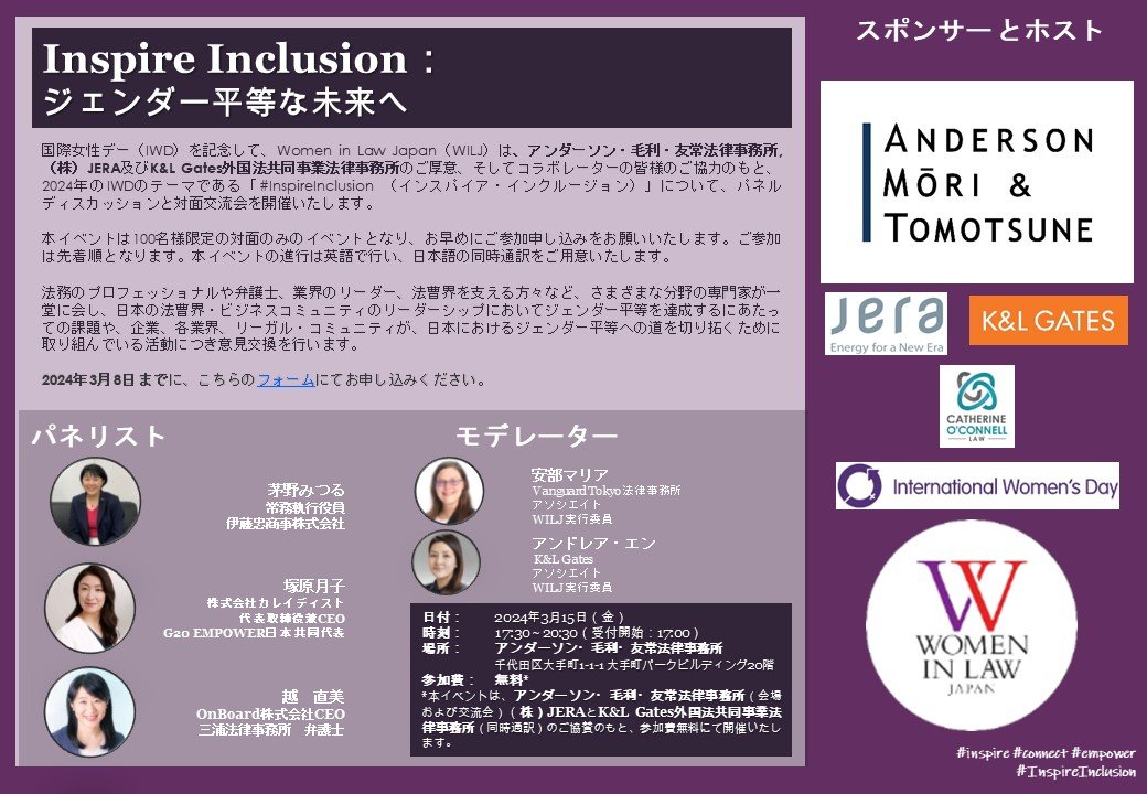 In celebration of International Women’s Day, Women in Law Japan (WILJ), with the generosity of Anderson Mori & Tomotsune, JERA and K&L Gates, and supported by our collaborators, is pleased to present this panel discussion and in-person networking event on inspiring inclusion which is the IWD theme for 2024: #InspireInclusion